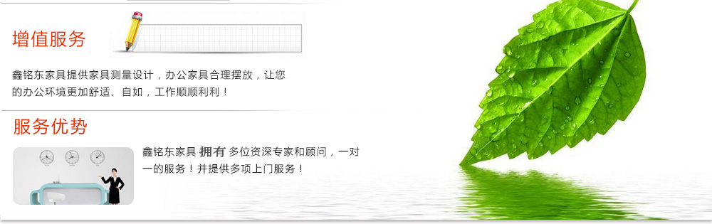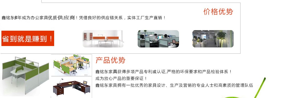 深圳市鑫銘東家具有限公司專業(yè)銷售各類辦公家具!產(chǎn)品涉及多種系列,如:班臺(tái)、班椅、屏風(fēng)、會(huì)議桌、會(huì)議椅、辦公沙發(fā)、茶幾、辦公桌、文件柜、電腦桌椅、各式餐臺(tái)、餐椅、書(shū)柜等辦公家具。 鑫銘東家具擁有一批優(yōu)秀的家具設(shè)計(jì)、生產(chǎn)及營(yíng)銷的專業(yè)人士和高素質(zhì)的管理隊(duì)伍。銘東家具以"先難后易"之戰(zhàn)略,在產(chǎn)品結(jié)構(gòu)、產(chǎn)品質(zhì)量及服務(wù)水平方面,均推陳出新,力求完善,精益求精。使我們的產(chǎn)品質(zhì)量保持在國(guó)內(nèi)外家具潮流的先進(jìn)水平,力求滿足客戶的特殊需求。鑫銘東家具多年來(lái)致力于環(huán)保、實(shí)用家具的設(shè)計(jì)與開(kāi)發(fā),集生產(chǎn)、銷售、服務(wù)于一體。本著"以人為本"的設(shè)計(jì)理念,大量開(kāi)發(fā)符合人體工程學(xué)的各種產(chǎn)品,以"誠(chéng)信為本"的質(zhì)量方針,真材實(shí)料,認(rèn)認(rèn)真真做產(chǎn)品,實(shí)實(shí)在在做人。鑫銘東家具更致力于創(chuàng)造"零維修率"的制造境界,實(shí)現(xiàn)"沒(méi)有維修的服務(wù)才是最好服務(wù)"的口號(hào)》了解更多